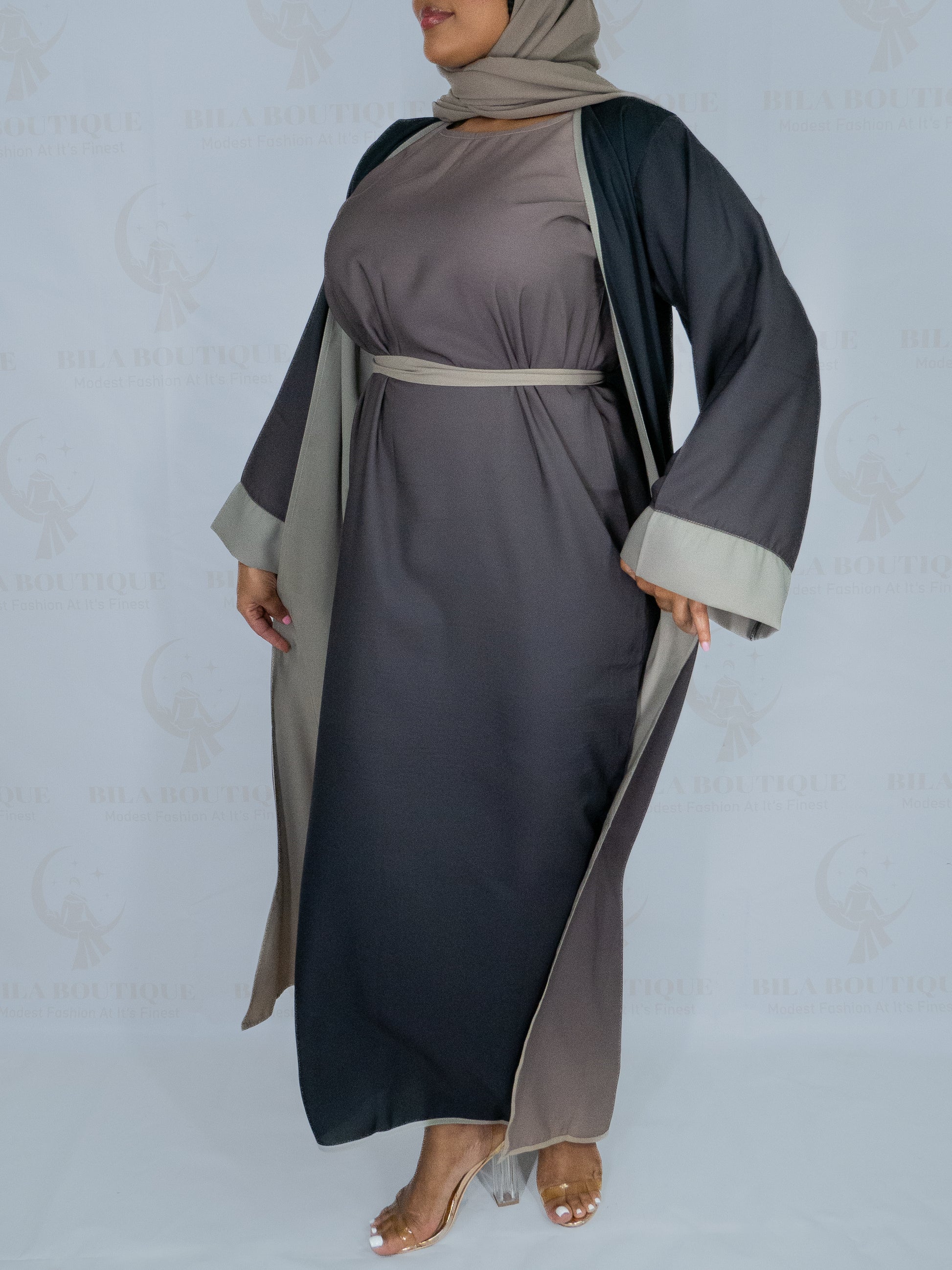 This abaya features an open abaya with gradient design. This item comes with an outer piece, an inner piece, a belt and a hijab.