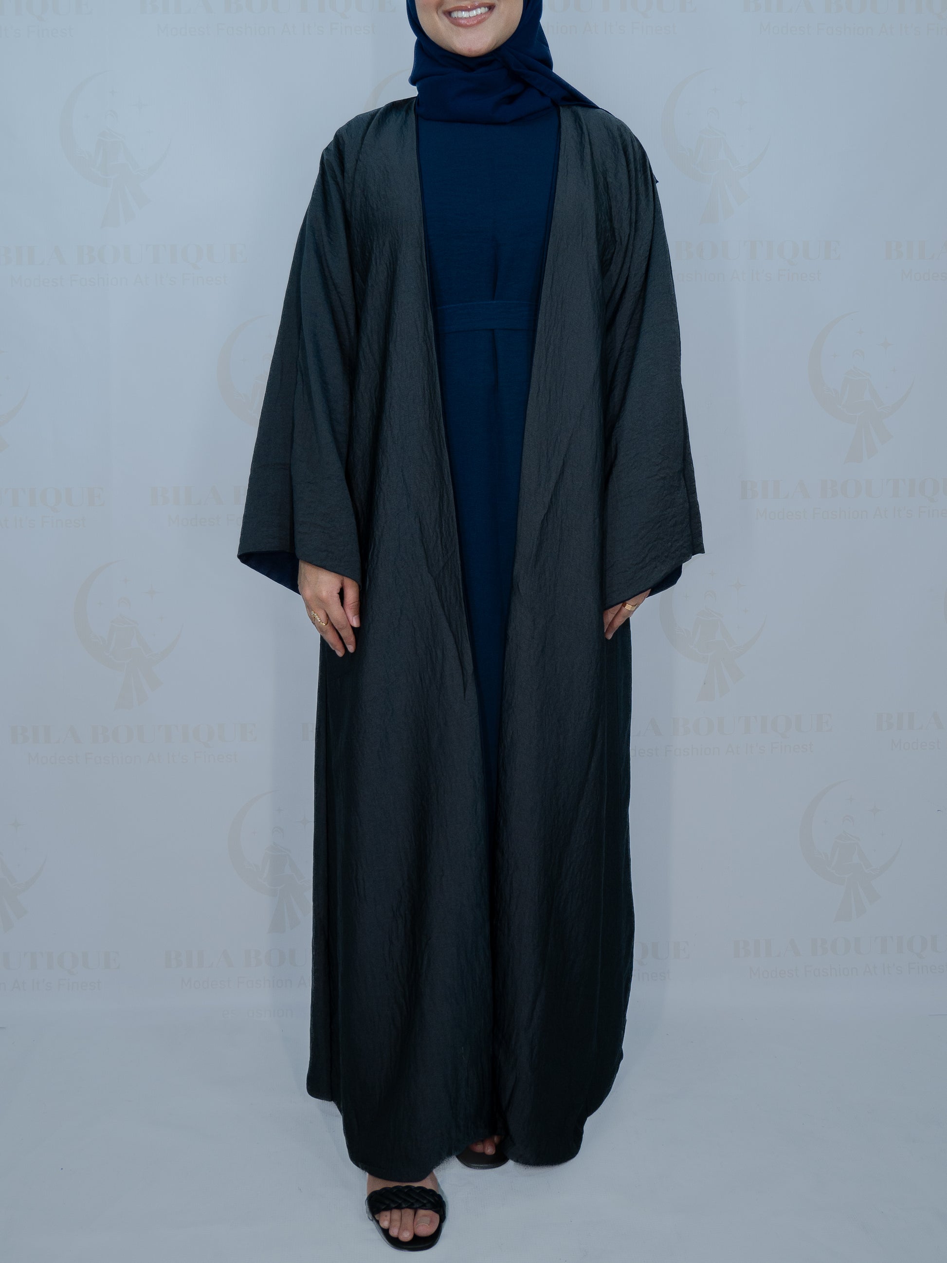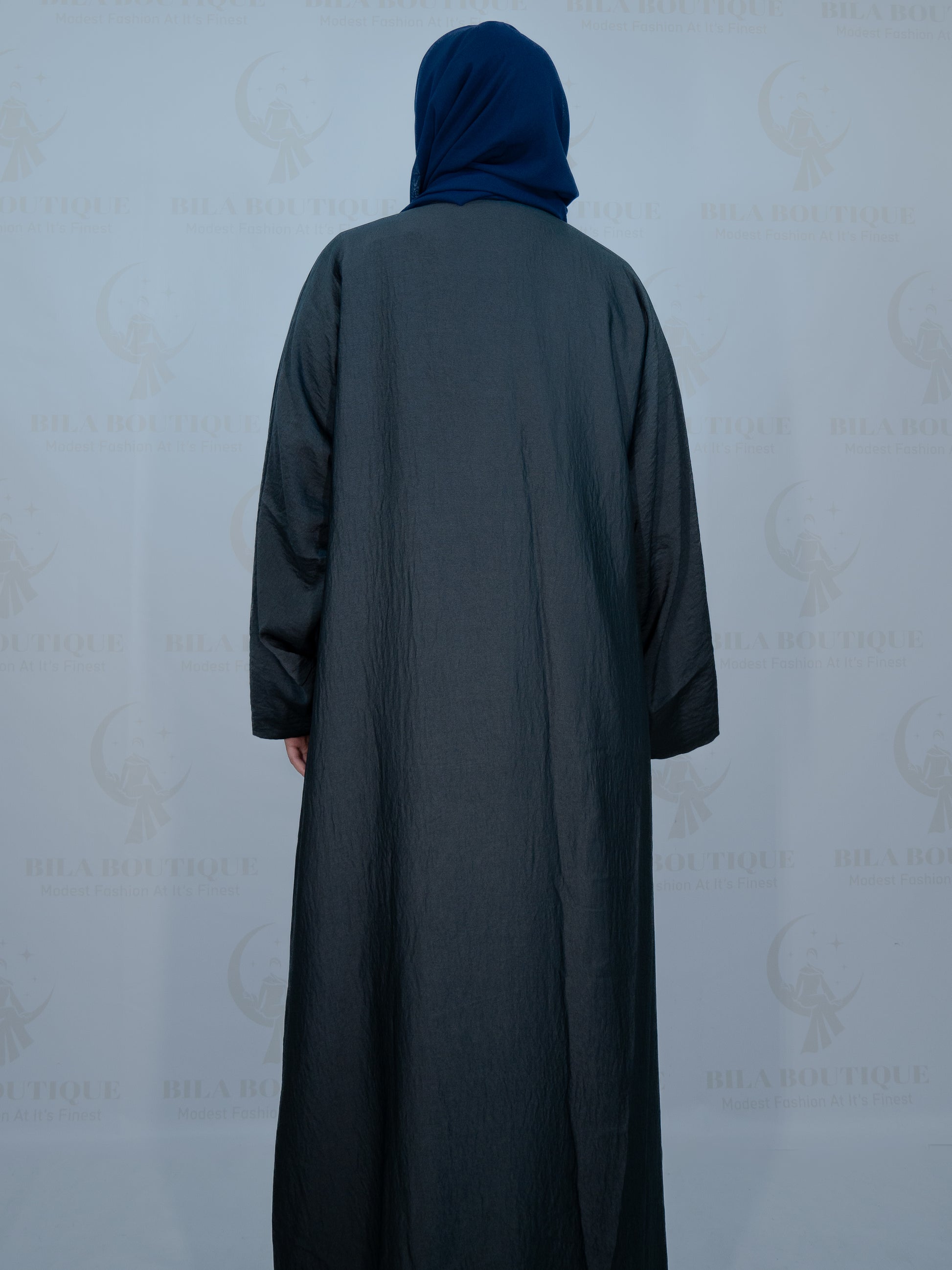 This abaya can be worn two ways, one side is blue and the other is grey. This item comes with the double sided outer abaya, an inner dress, a belt and a hijab.