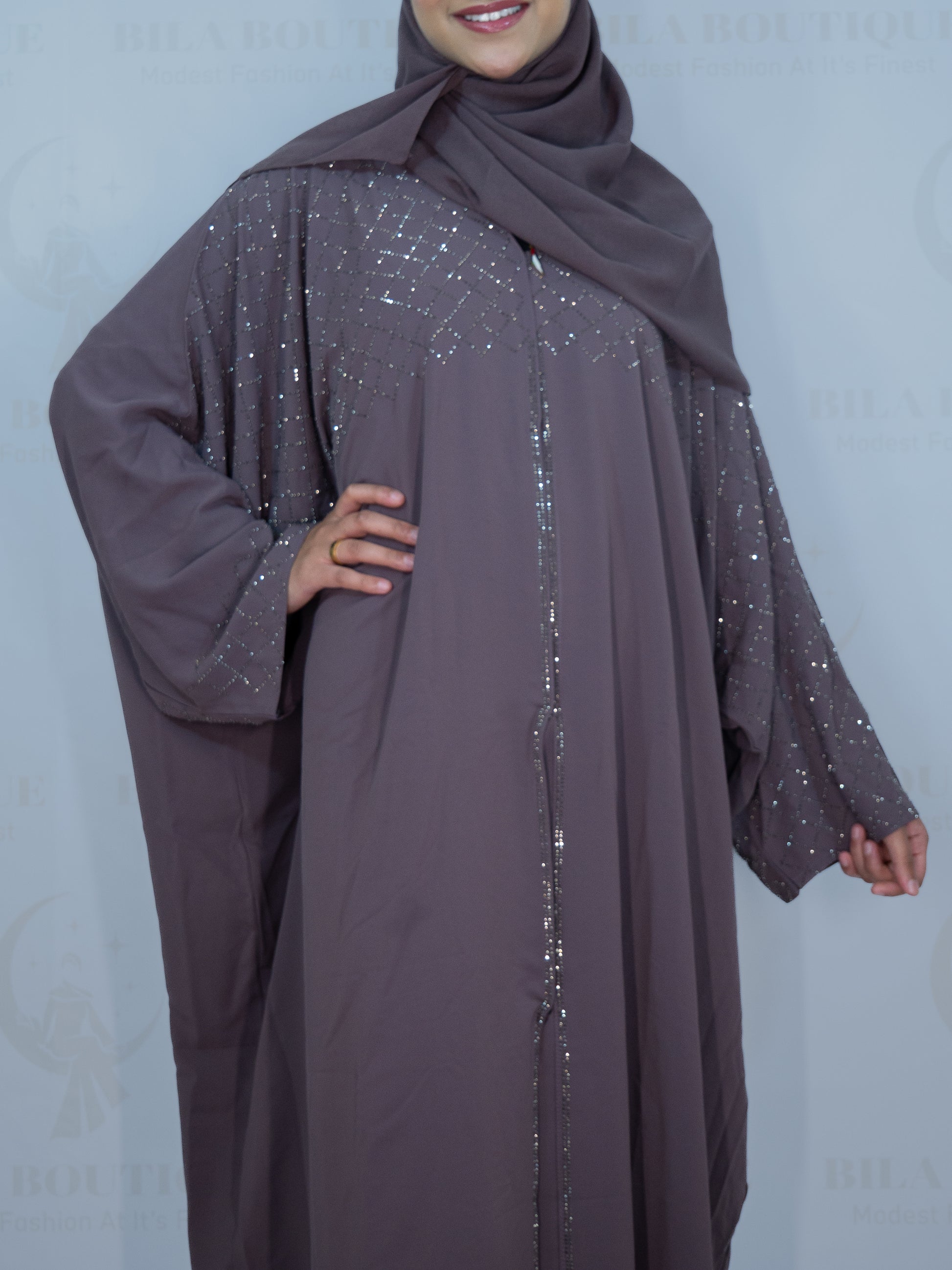 This Bahraini batwing styled abaya comes with purple gemmed diamond design on the abaya. This item comes with a closed abaya and hijab.