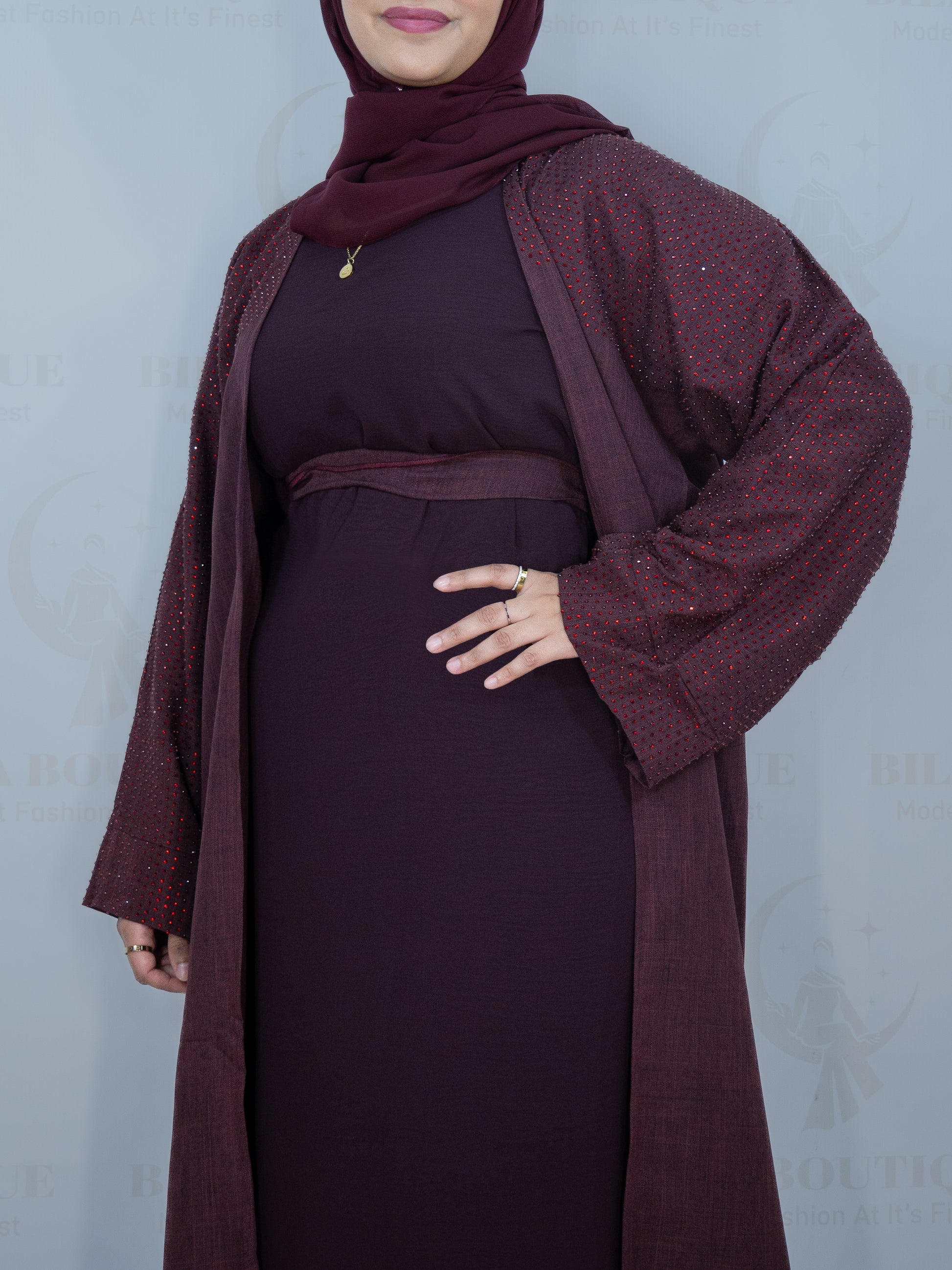 This red abaya has matching red gems across the entire sleeve and top of the abaya. This item comes with an outer piece, inner piece, a belt and a hijab.